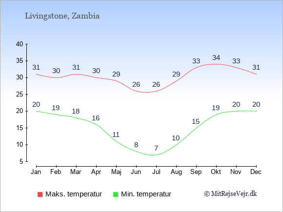 Graferne viser de gennemsnitlige maksimale temperaturer i Livingstone og København (typisk når solen står højest på himmelen om eftermiddagen) og de gennemsnitlige minimale temperaturer (typisk den laveste temperatur som måles om natten).