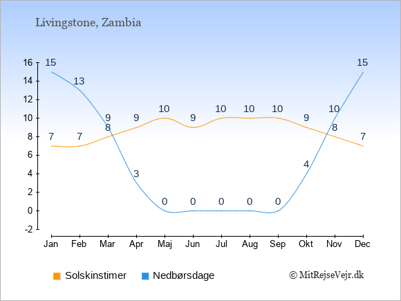 Graferne viser det gennemsnitlige antal solskinstimer i Livingstone pr. dag samt det gennemsnitlige antal dage med nedbør i Livingstone sammenlignet med København.