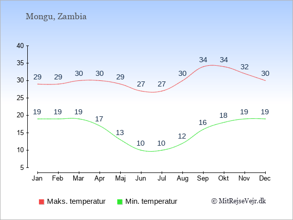 Grafen viser de gennemsnitlige maksimale temperaturer i Mongu (som oftest den værdi, der er målt midt på dagen) og de gennemsnitlige minimale temperaturer (som oftest den værdi, der er målt midt om natten).
