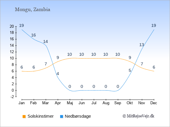 Grafen viser antallet af solskinstimer i Mongu (d.v.s. det gennemsnitlige antal timer pr. dag hvor solen skinner), samt antallet af nedbørsdage (d.v.s. det gennemsnitlige antal dage i en given måned,